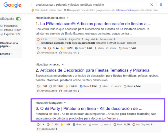 En Oh hi Party estamos comenzando con el posicionamiento SEO, y en poco tiempo hemos logrado estar en la tercera posición de Google con palabras tan importantes como «productos para piñatería y fiestas temáticas en Medellín».
